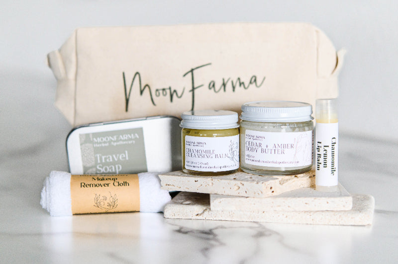 Our new π¬πππππππππ π»πππππ π²ππ has everything you need for a little time away. All of our favorite mini sized products in a MoonFarma branded zipper bag.Β